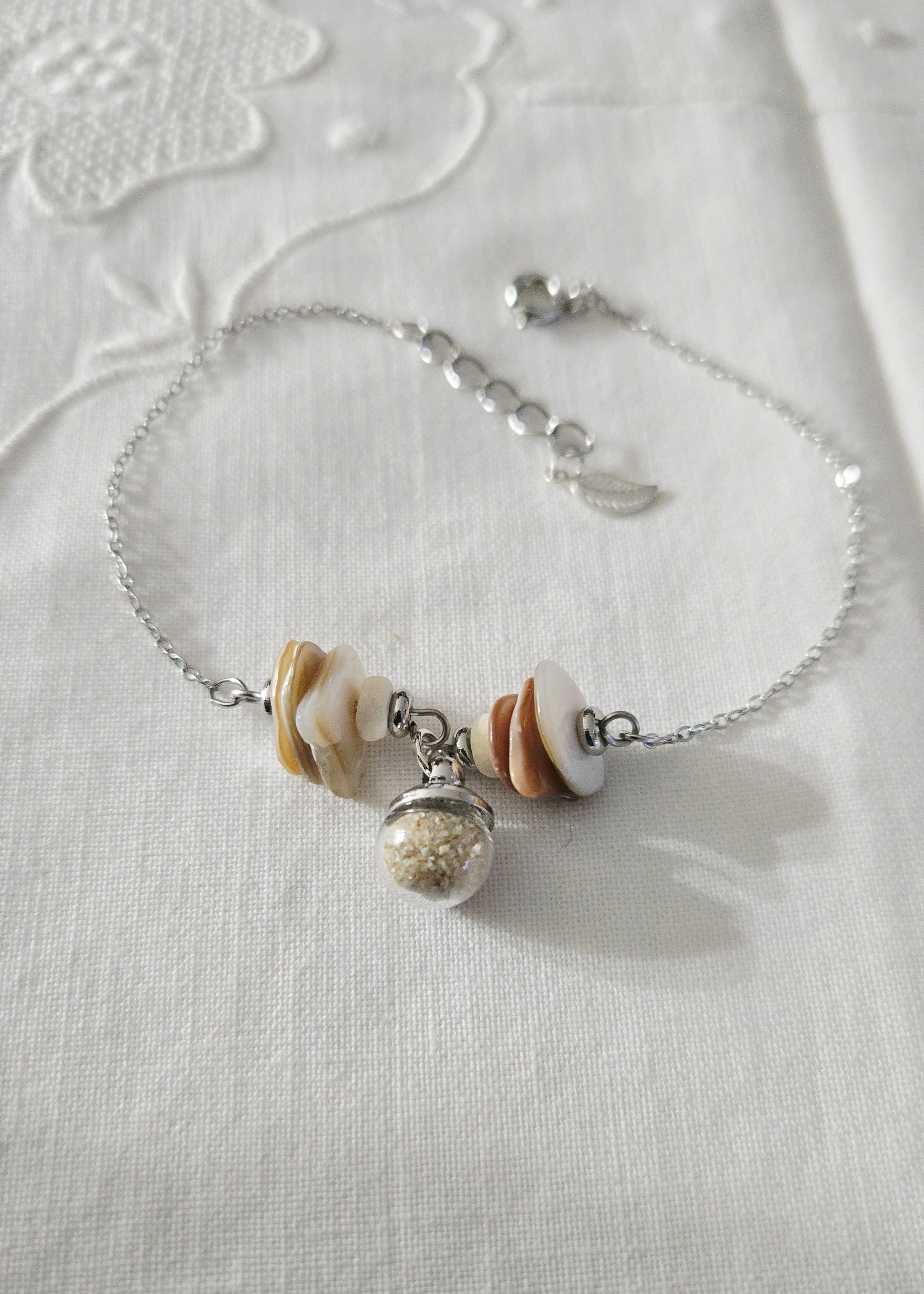- Materiaux : Perle en verre soufflé, nacre naturelle, acier inoxydable, sable de plage naturel.