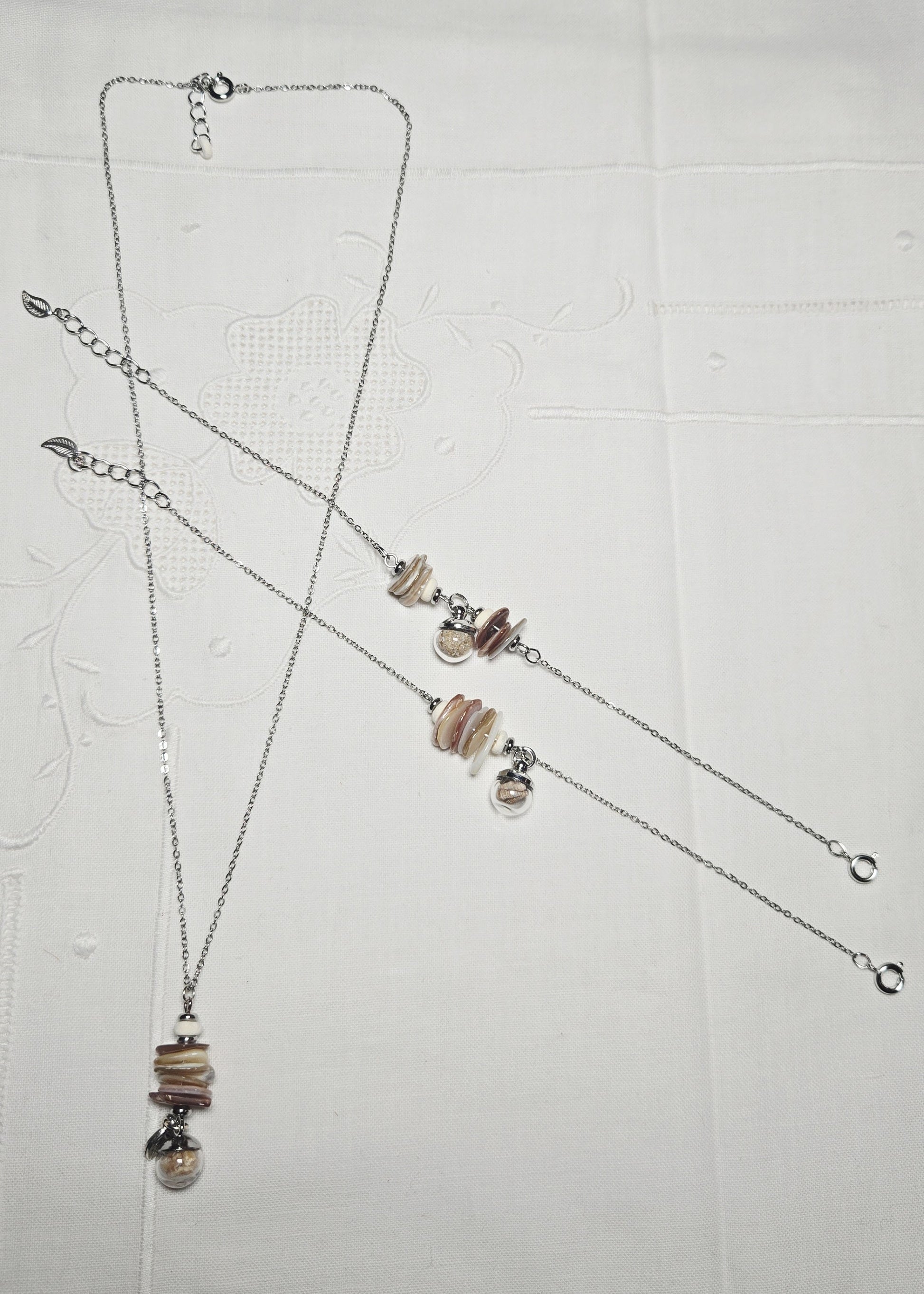 - Bracelets et collier enchanteurs, surmontés d'une perle de souhait en verre soufflé remplie de vrai sable de plage.