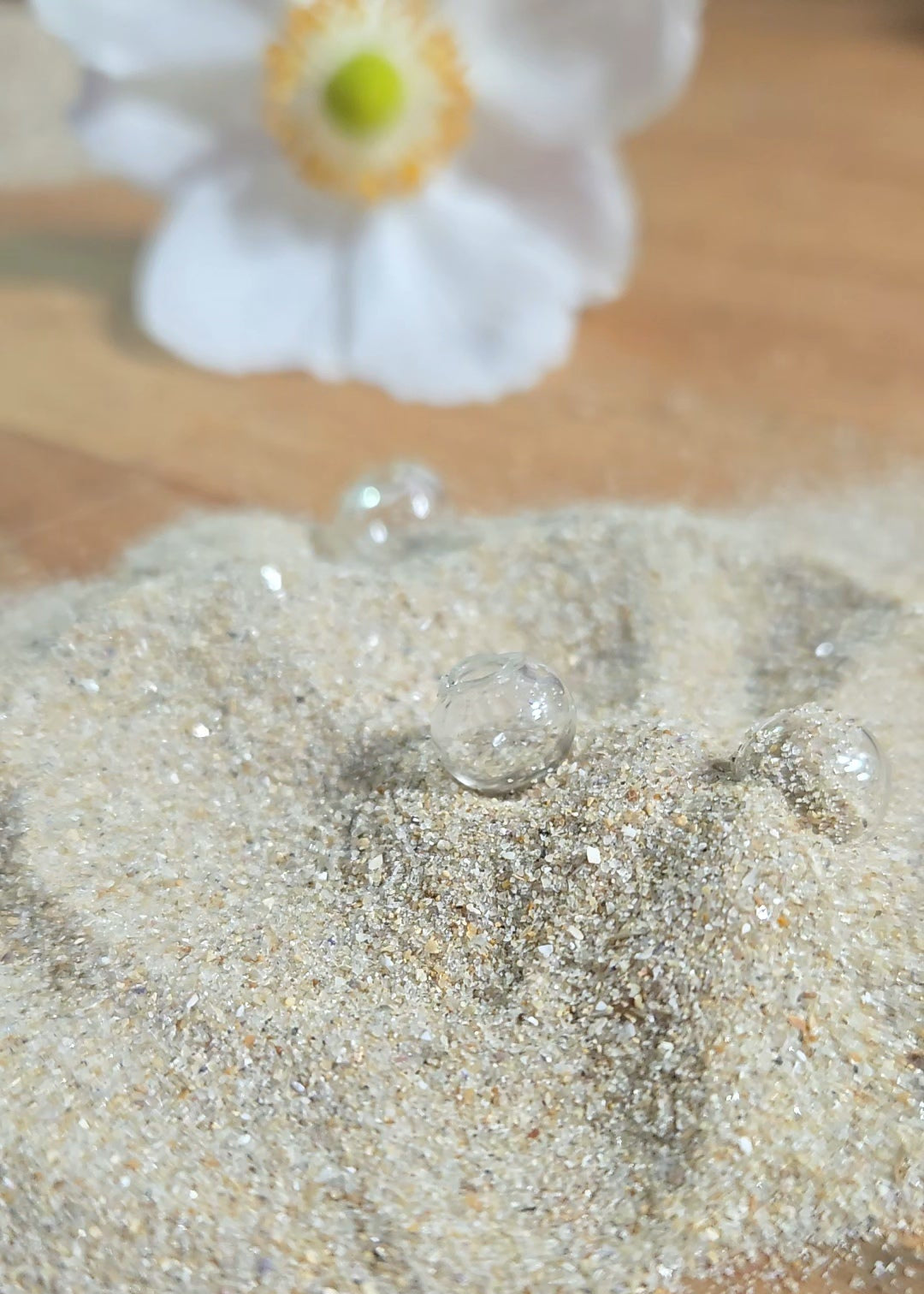 - Materiaux : Perle en verre soufflé, doré, sable de plage naturel.