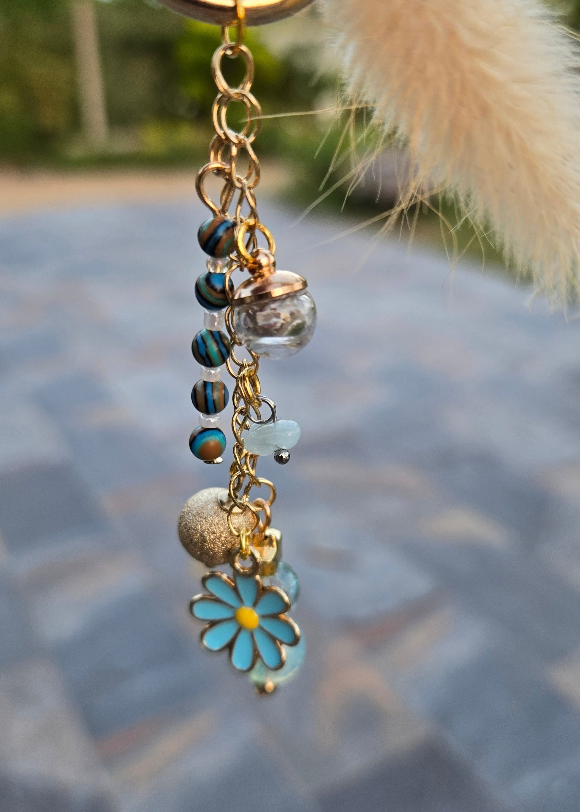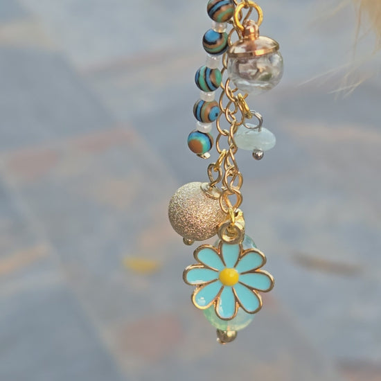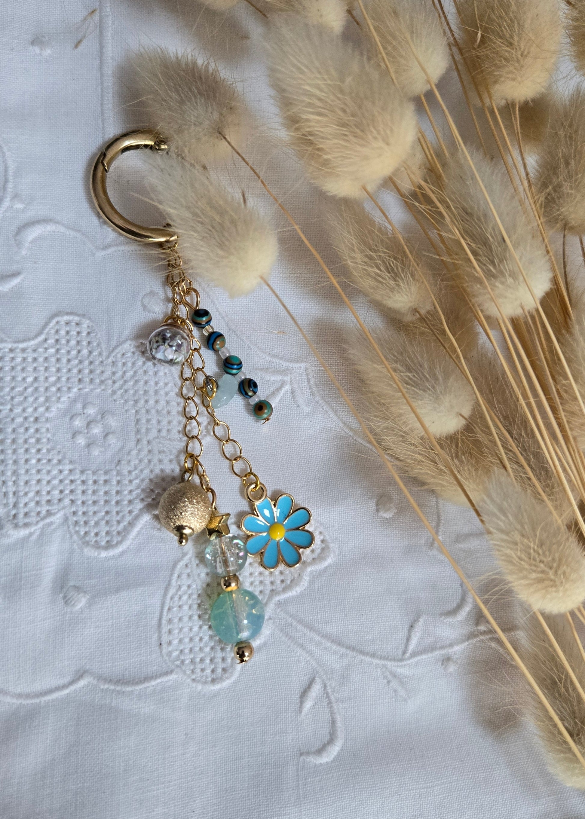 - Porte-bonheur surmonté de jolies perles, d'une marguerite bleue